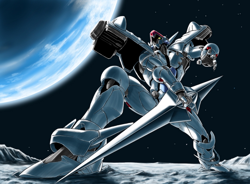 tukiwani, yagokoro eirin, gundam, touhou, highres, armor, backlighting, bow (weapon), female focus, foreshortening, holding, holding weapon, light particles, mecha, mechanization, no humans, outstretched arm, robot, upper body, weapon