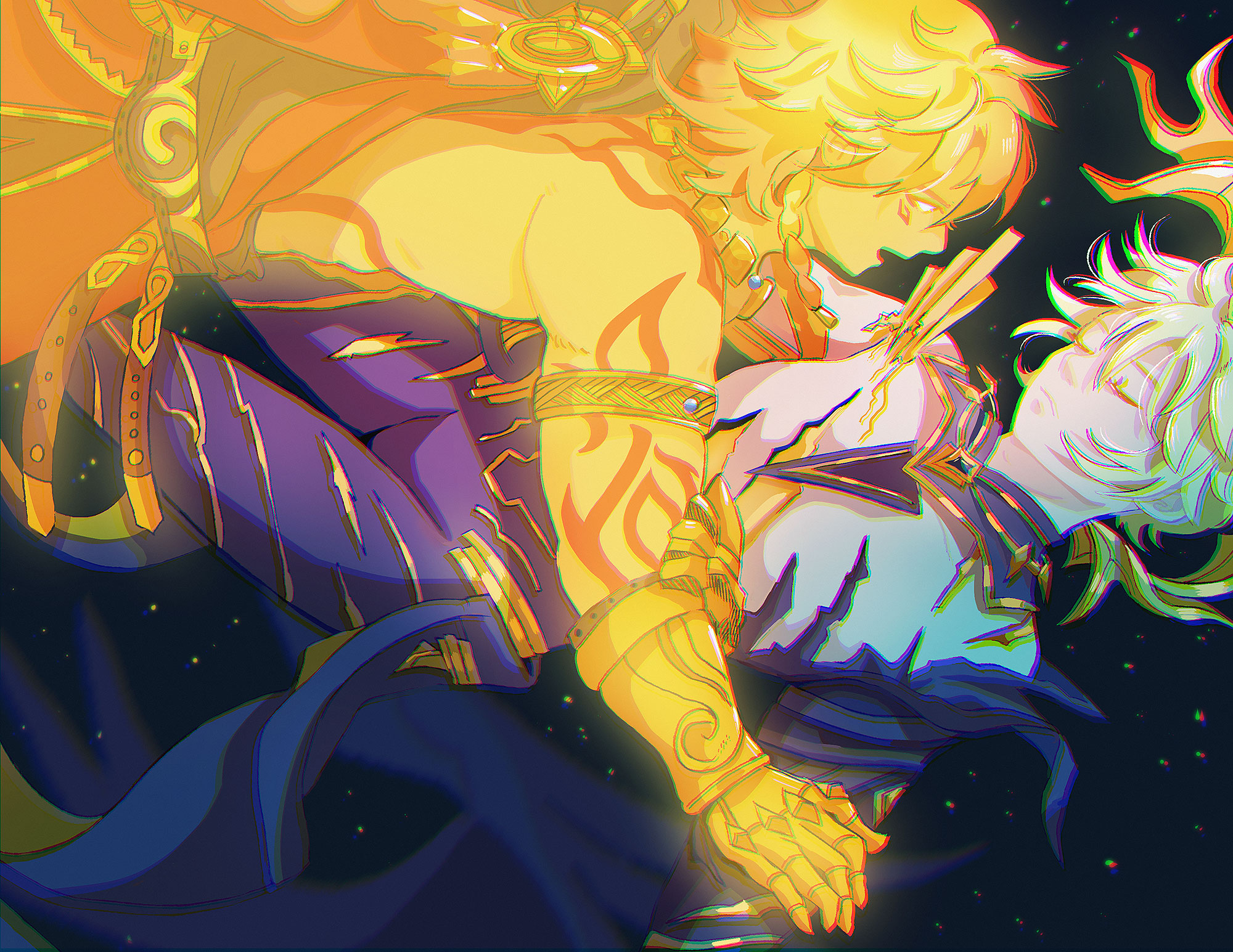 2boysarm tattooarmletback tattooblack coatblonde hairbraidcapeclosed eyescoatcracked skinfacial tattoogradient hairjewelrymale focusmaterial growthmedium hairmulticolored hairmultiple boysopen clothesopen coatred capered hairred tattooshort hairside braidside capetattooyaoiyellow bloodyellow eyes