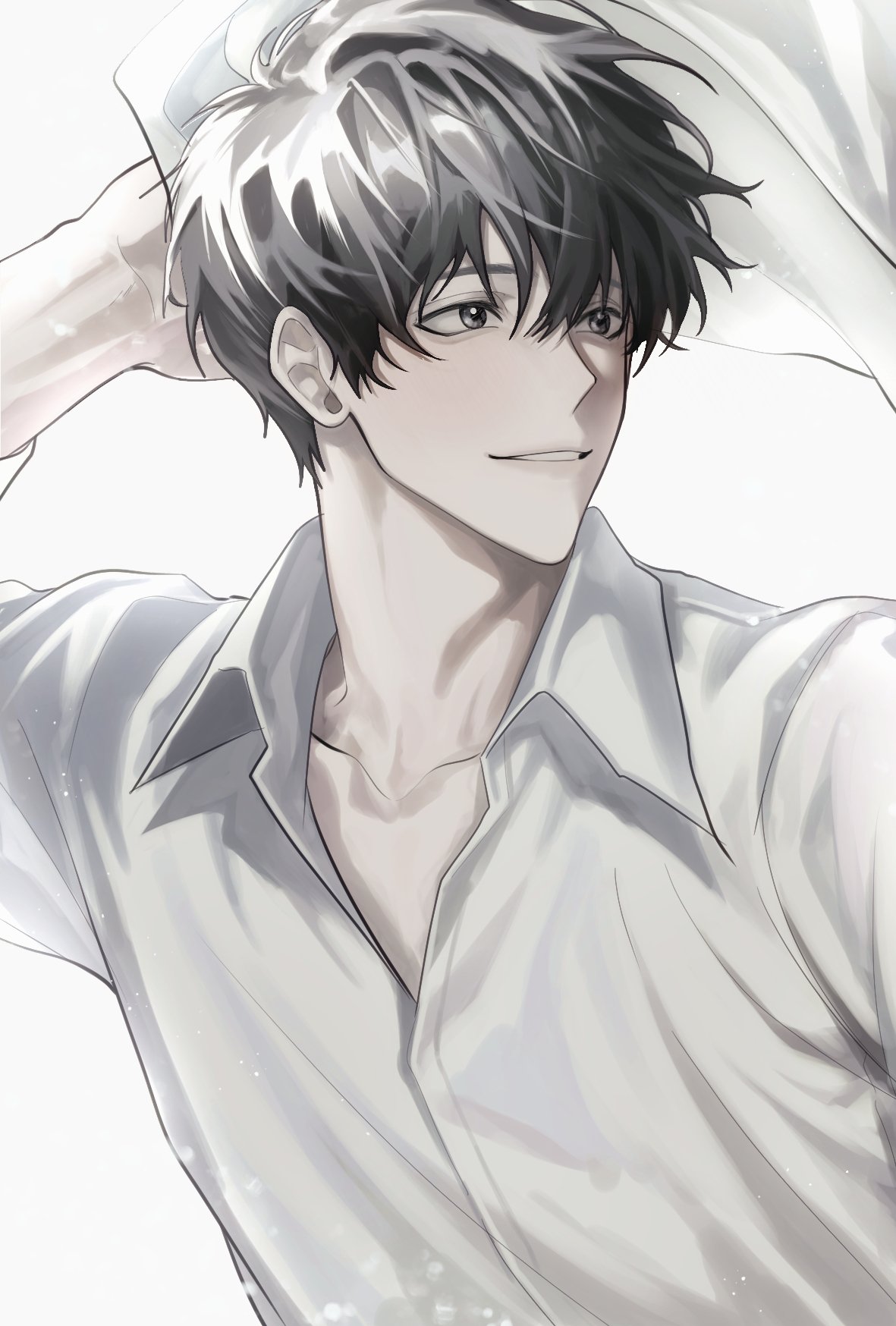 :d1boyaegyo salarm behind headblack eyesblack haircollared shirtgrinlight particleslooking to the sidemale focusopen mouthshirtshort hairsmilesolowhite shirt