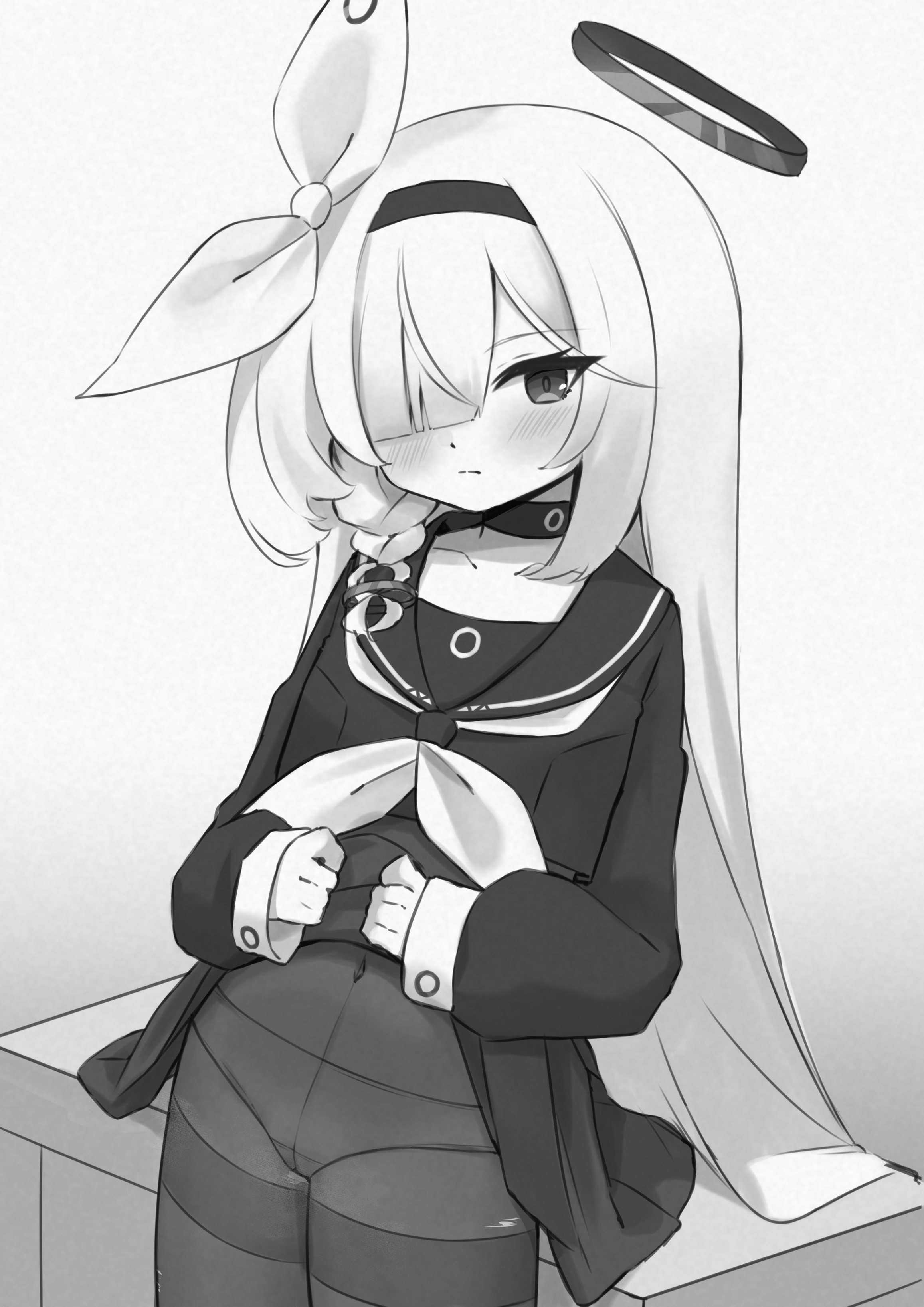 1girlblushbraidchokerclosed mouthclothes liftcowboy shotgreyscalehair over one eyehairbandhalolifting own clotheslong hairlong sleeveslooking at viewermonochromeneckerchiefpantiespanties under pantyhosepantyhosesailor collarsailor shirtschool uniformserafukushirtskirtskirt liftsolothighband pantyhoseunderwearvery long hair