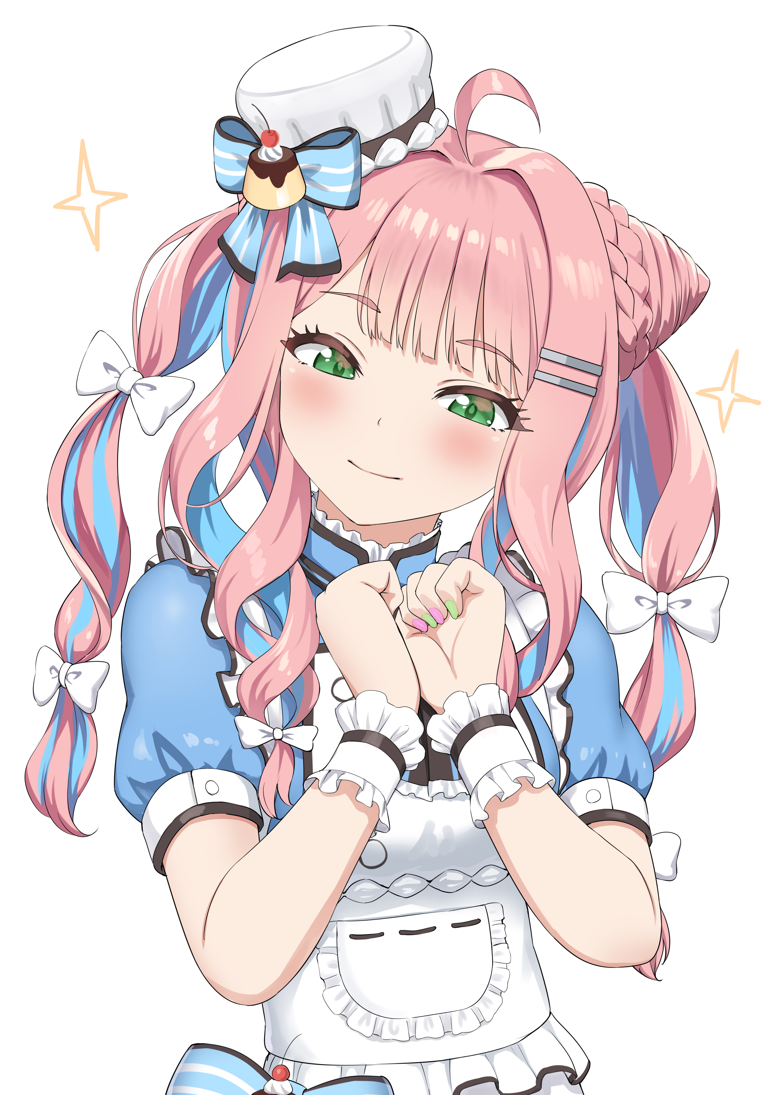 1girlahogeapronblue hairblue shirtbowbraidbun with braided baseclosed mouthfrilled wristbandgreen eyesgreen nailshair bowhair ornamenthairpinhathat bowmulticolored hairpink hairpink nailsshirtshort sleevessidelockssolotwintailswhite apronwhite backgroundwhite bowwhite hat