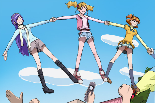 matoyama, original, lowres, 1boy, 2girls, all fours, arm support, ass, blue background, breasts, brown eyes, brown hair, cooperative fellatio, cooperative handjob, cum, cum on body, cum on hair, earrings, facial, fellatio, from above, handjob, hanging breasts, huge ass, jewelry, large breasts, large penis, lips, long hair, looking at viewer, multiple girls, nude, oekaki, oral, penis, pov, short hair, teamwork, teamwork (sexual), tongue, tongue out, uncensored