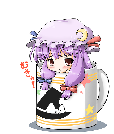 1boy1girlblushchibicrescentcrescent hat ornamentcrescent mooncupfemale focushathat ornamentin containerin cuplong hairmini personminigirlmoonmugmukyuuprint mugpurple hairsolowitch hat