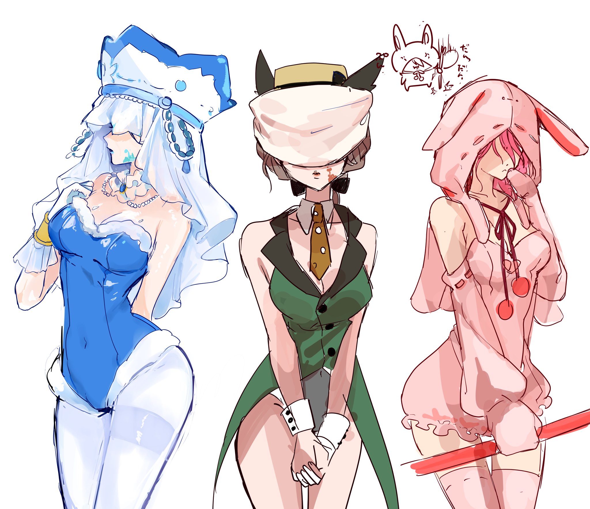 1girlanimal earsbare shouldersblue leotardbowbreastsbrown haircleavagecovered eyesdetached collardetached sleevesdressgloveshair over eyeshathoodjewelrylacelarge breastsleotardmedium breastsnecklacenecktiepantyhosepink hairpink pantyhoseplayboy bunnyrabbit earsrabbit tailshort hairsimple backgroundstaffswordtailthighhighsveilweaponwhite backgroundwhite gloveswhite hairwhite pantyhoseyield hshs