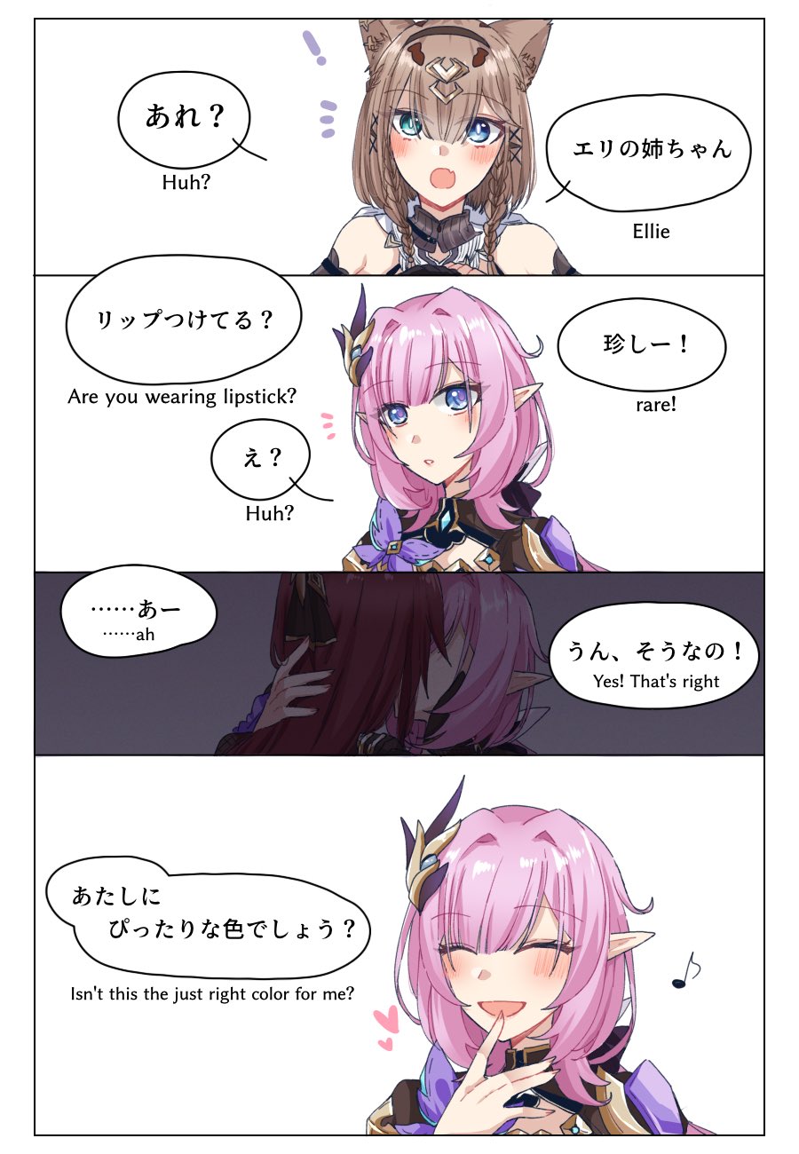 3girlsanimal earsbare shouldersbilingual textblue eyesbrown haircat earscat girlcoupleelfenglish textgreen eyesheterokisslong hairmixed-language textmultiple girlspink hairpointy earsshirtshort hair with long locksshrug (clothing)smilespeech bubbletoufu 0626white shirtyuri