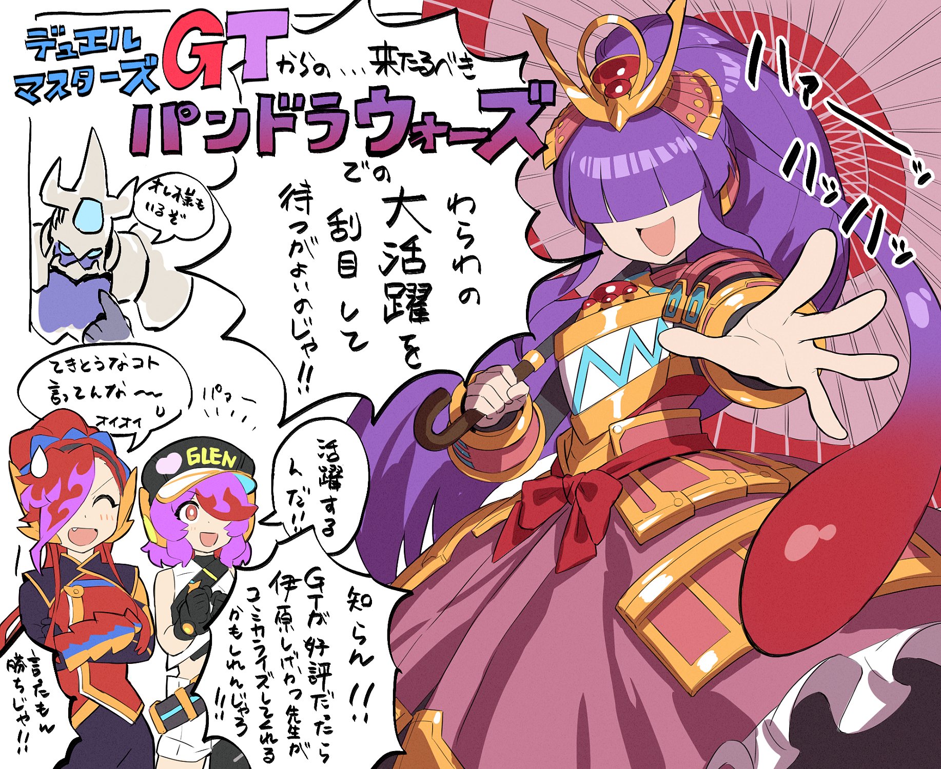 1boy2girlsarmorblack glovesblack hatclosed eyescrossed armsdressear protectionfangglenturret (duel masters)gloveshair over eyeshair over one eyehathelmethigh ponytailholdingholding umbrellajapanese armorkabuto (helmet)long hairmonstermultiple boysmultiple girlsopen mouthponytailpurple hairreachingreaching towards viewerred dressred eyesred hairred shirtshirtshortsspeech bubblesweatdroptentacle hairtrapumbrellawhite shirtwhite shorts