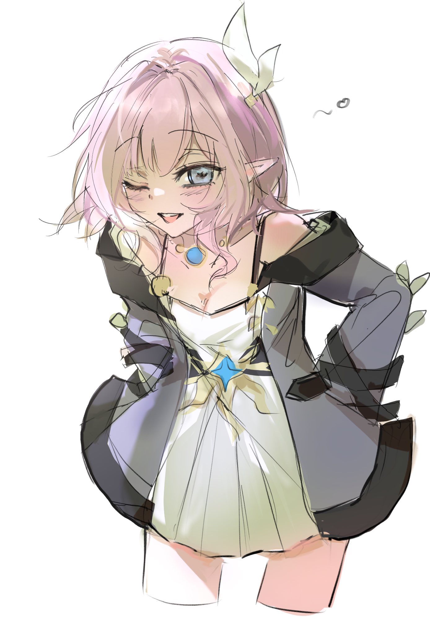 :o1girlbare shouldersblue eyesbreastscleavagecoatcyrene (aedes elysiae) (honkai: star rail)dresshair ornamentjewelryjiuxi030looking at viewernecklaceone eye closedpink hairpointy earspurple coatsimple backgroundsmall breastssolowhite backgroundwhite dress