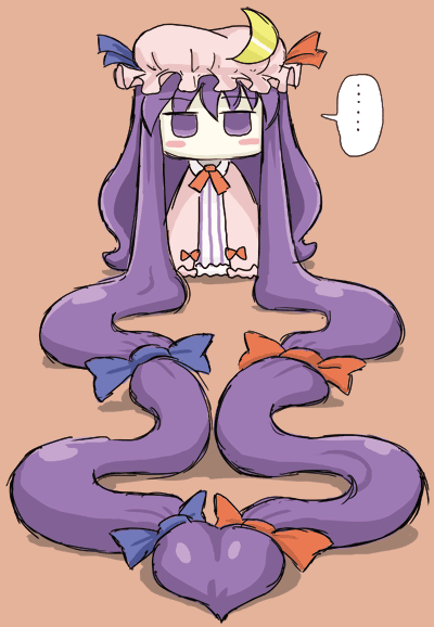 1girlchibicrescentcrescent hat ornamentfemale focushair ribbonhathat ornamentlong hairpurple eyespurple hairribbonsimple backgroundsolovery long hair