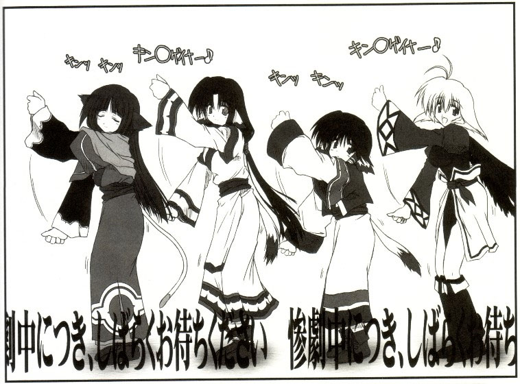 4girlsanimal earsantenna hairclosed eyesdancinglong hairmonochromemultiple girlsparodyshort hairsimple backgroundtailthe monkeywings