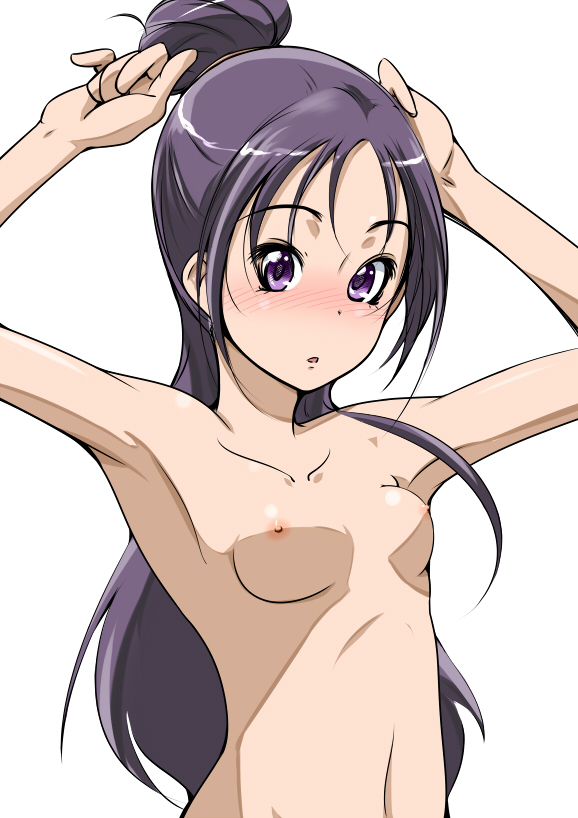 blushbreastsFlag for Deletionhair bunlong hairlooking at viewernavelnipplesnudepurple eyespurple hair