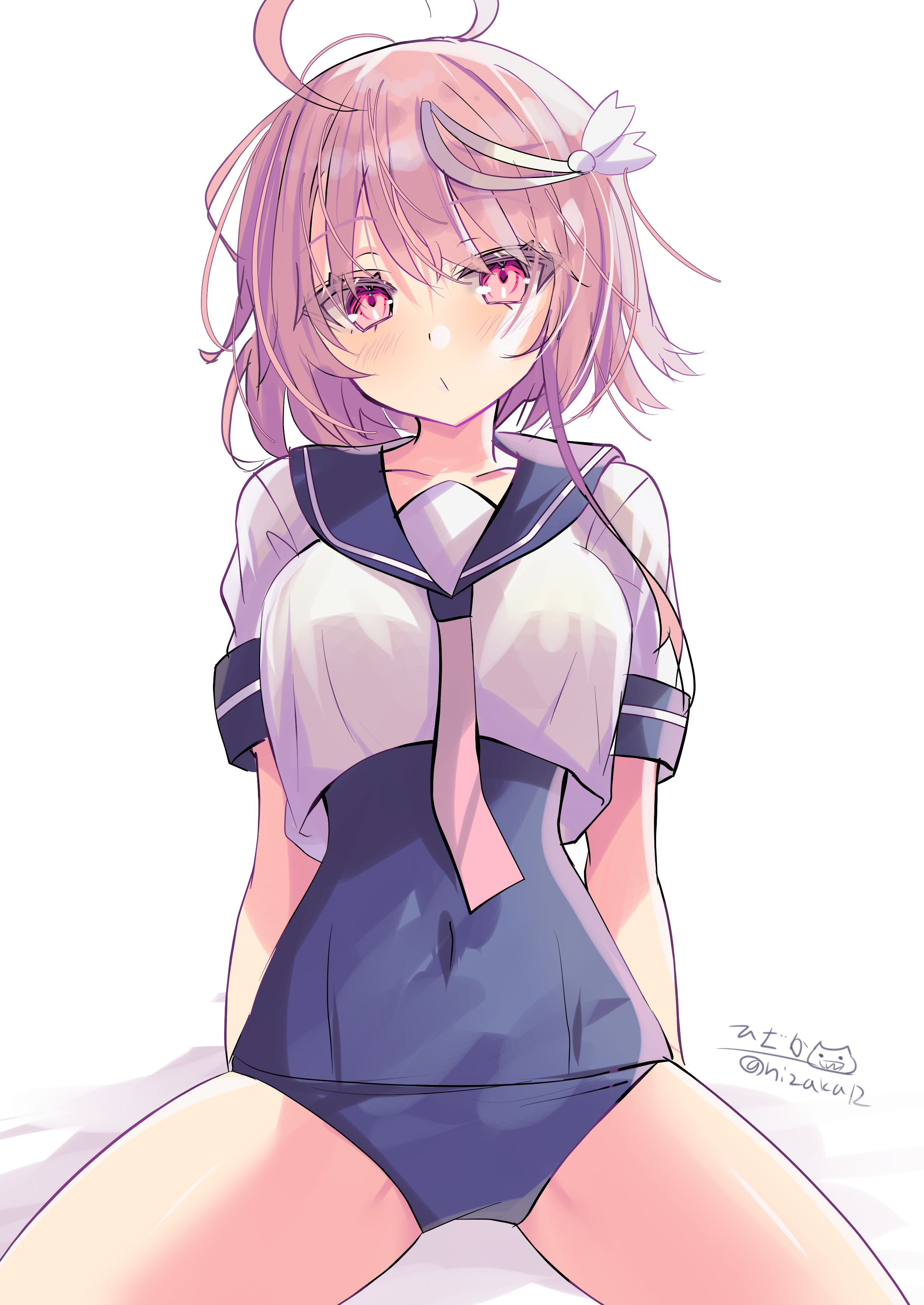 1girlblue one-piece swimsuitblue sailor collarhair ornamentneckerchiefold school swimsuitone-hour drawing challengeone-piece swimsuitpink hairpink neckerchiefred eyessailor collarsailor shirtschool swimsuitschool uniformserafukushirtshort hairsimple backgroundsittingsoloswimsuitwhite backgroundwhite shirt