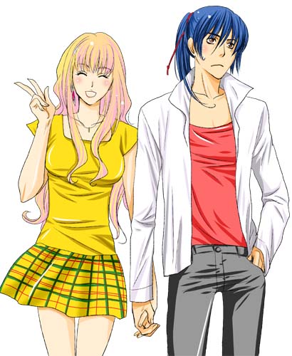 :d00s1boy1girlbeltblue hairbreastsbuckleclosed eyescontemporaryheteroholding handslong hairlong sleeveslooking at vieweropen mouthpantspink hairpleated skirtshirtsimple backgroundskirtsmilestandingt-shirtvvery long hairwavingwhite backgroundyellow skirt
