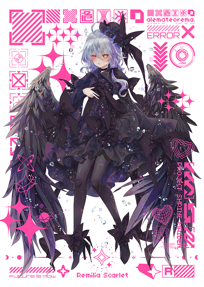 1girlalternate wingsblack bowblack dressblack hatblack pantyhoseblack ribbonblack shoesbowcharacter namedressfeathered wingsfrilled hatfrillshair over shoulderhathat ribbonhearthigh heelslong hairlong sleevesmob cappantyhosepurple hairred eyesribbonshoessolotilted headwearwings