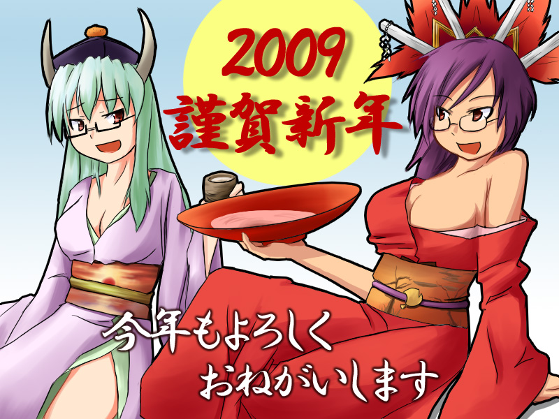 2girlsalcoholbreastsfemale focusglassesgradient backgroundhathornsjapanese clotheskimonolong hairmultiple girlsnew yearpurple hairred eyessakeshort hairsitting