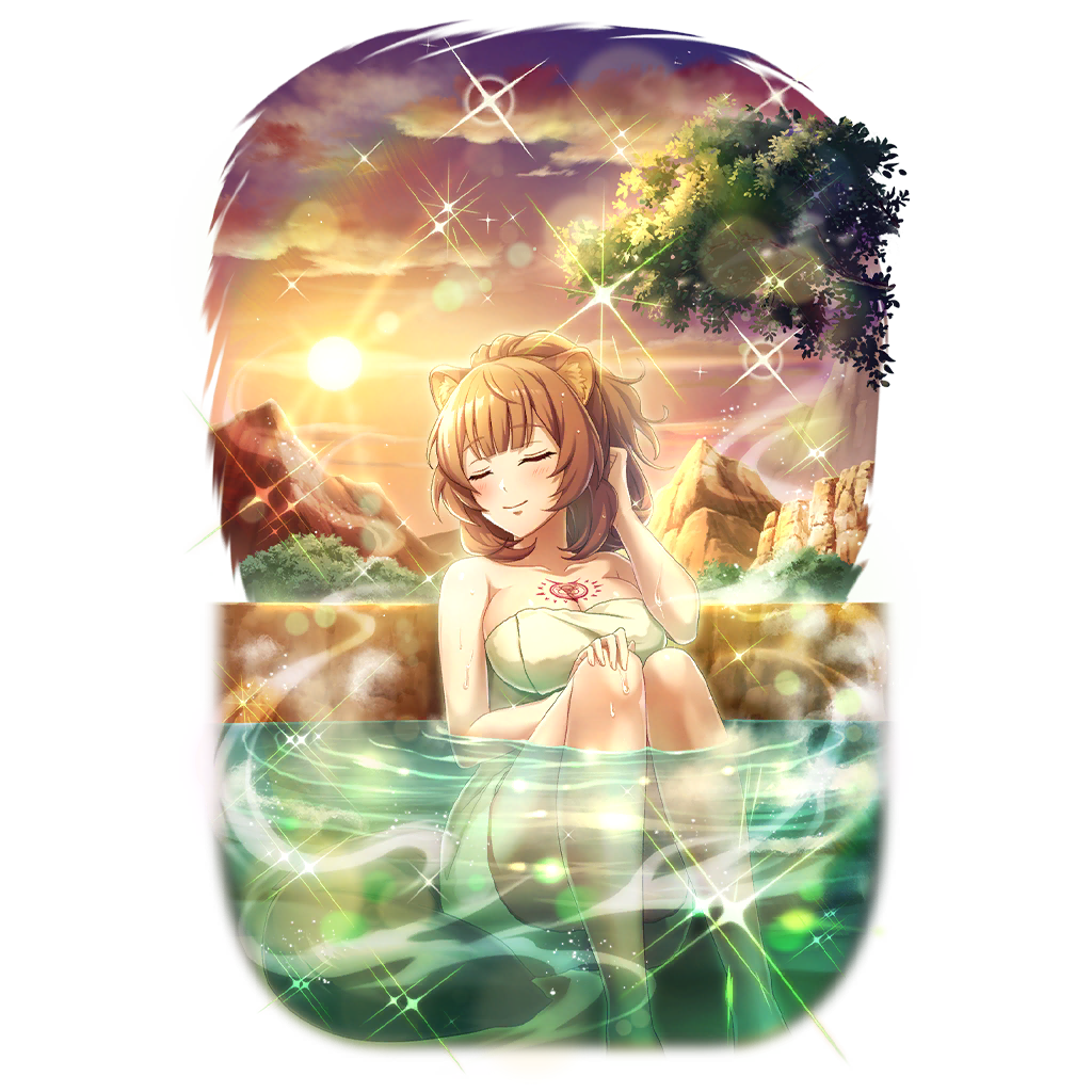 1girlanimal ear fluffanimal earsblunt bangsblushbreastschest tattoocleavageclosed eyescloudcloudy skycollarboneeyelashesfacing to the sidefolded hairfull bodyhand on own kneehand upin waterknees uplarge breastslight particlesmedium hairmountainous horizonnaked towelno tailonsenoutdoorspartially submergedpurple skyraccoon earsraccoon girlsimple backgroundsittingskyslave brandsmilesolosparklesteamsunsettattootoweltransparent backgroundtreeyellow sky