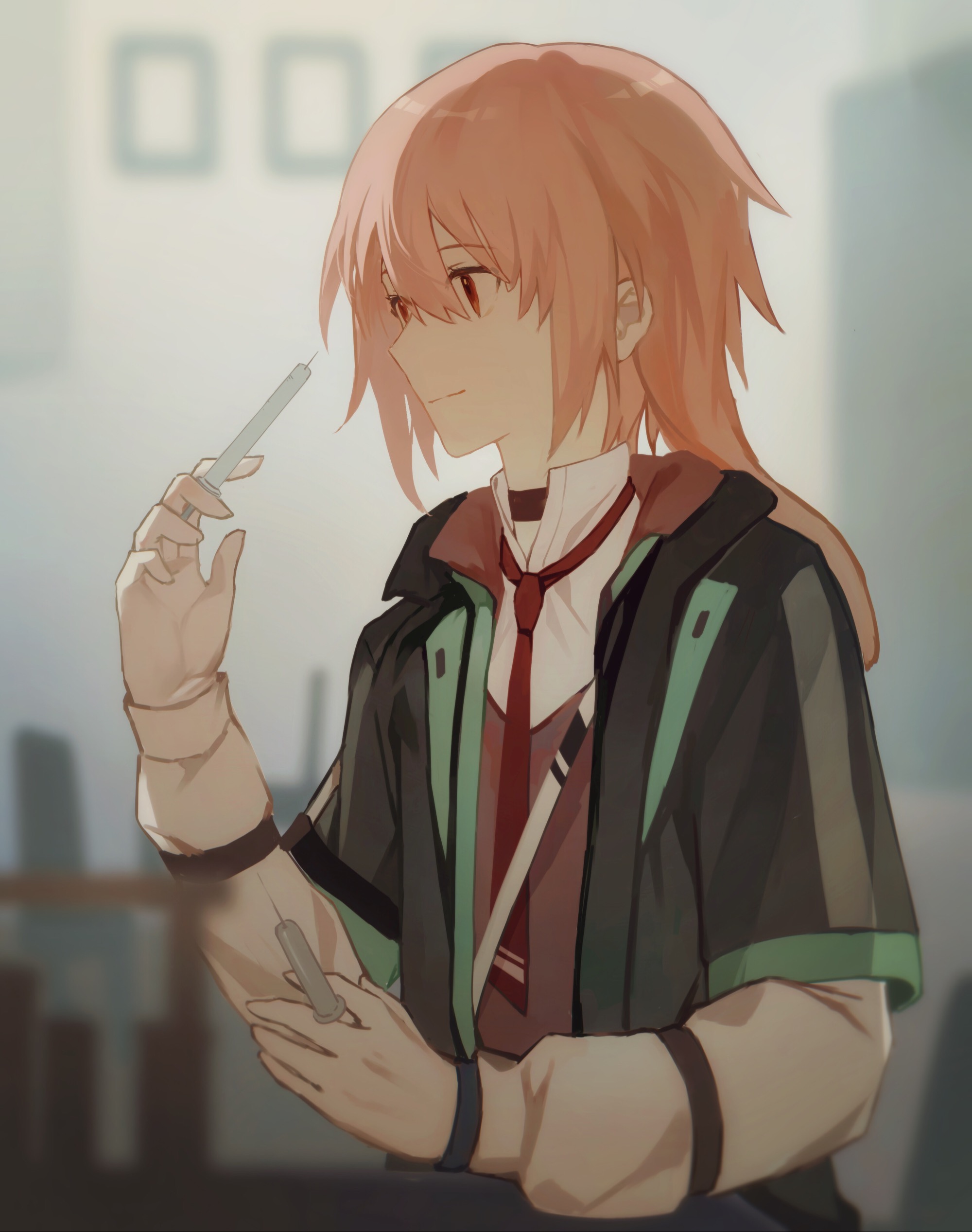 1boyanimal earsblack chokerblack jacketchokerfacing to the sidegloveshair between eyesholdingholding syringehoodhood downjacketlooking aheadlop rabbit earsmale focusnecktiepink hairpopped collarrabbit boyrabbit earsred eyesred necktiesmilesyringewhite gloves