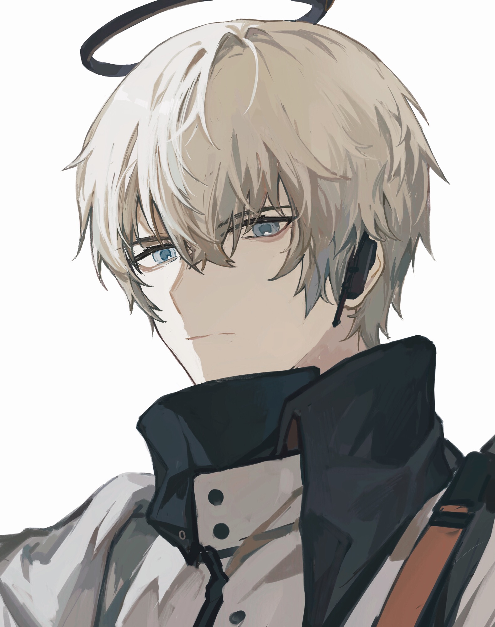 1boybags under eyesblack haloblonde hairblue eyescrossed bangsearpieceexpressionlesshair between eyeshalohigh collarlooking at viewermale focuspale skin