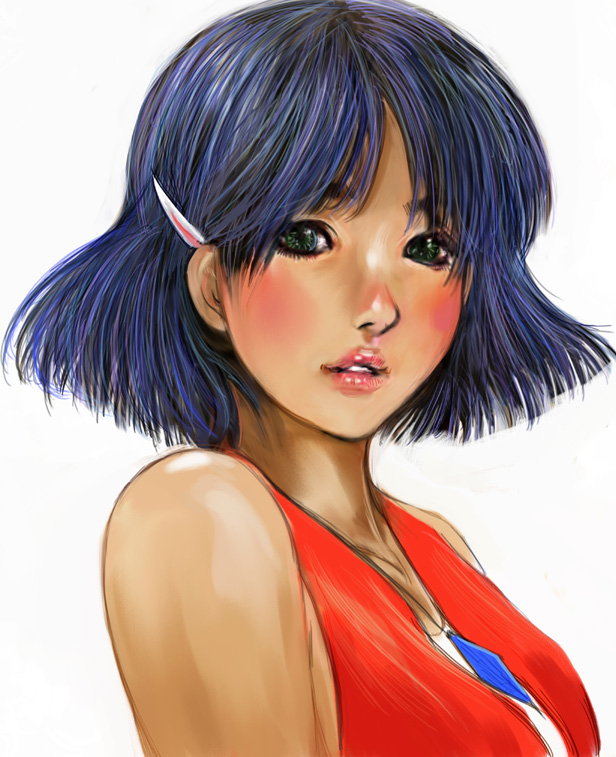 1990s (style)1girlbandeaubare shouldersblue hairblushdark skindark-skinned femalefemale focusgreen eyeshair ornamenthairclipjewelrylipsnecklacerealisticretro artstyleshort hairsolostraplesstube topvestwhite bandeau