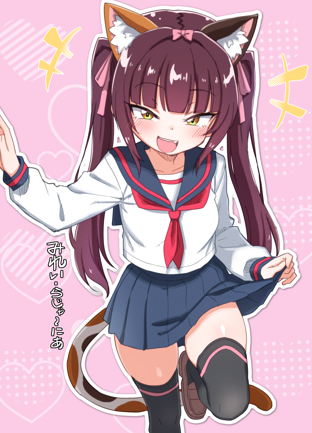 :d1boy1girlanimal ear fluffanimal earsblack thighhighsblue sailor collarblue skirtblunt bangsblushbreastsbrown eyesbrown shoescalico (pattern)cat earscat girlcat tailclothes liftfangfoot out of framehair ribbonloaferslong hairlong sleeveslooking at viewerneckerchiefopen mouthoutlinepink backgroundpink ribbonpleated skirtred hairred neckerchiefribbonsailor collarschool uniformserafukushirtshoesskirtskirt liftsmilesolostandingstanding on one legtailthighhighstwintailswhite outlinewhite shirtzettai ryouiki