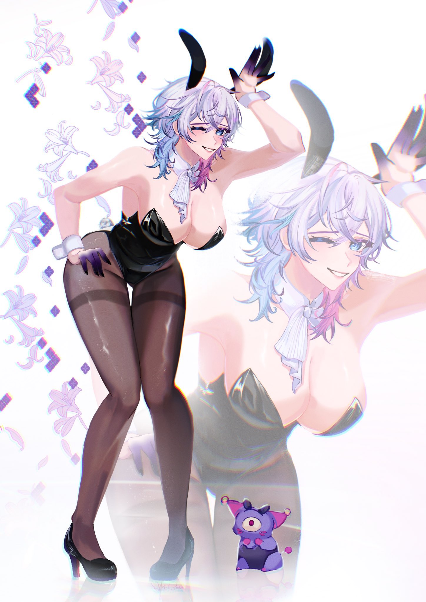 1girlanimal earsbare shouldersblack leotardblack skinblue eyesblue hairblushbreastscleavagecolored skincovered navelcreatureeyelashesfake animal earsflowerfull bodygenderswapgenderswap (mtf)gradient skingrey hairhair between eyeshand uphigh heelshighleghighleg leotardknees together feet apartlarge breastsleotardlily (flower)looking at viewermedium hairmulticolored hairone eye closedpantyhosepink hairplayboy bunnyrabbit earssmilesolostandingstraplessstrapless leotardvirtual youtuberwhite backgroundwhite wrist cuffswrist cuffs