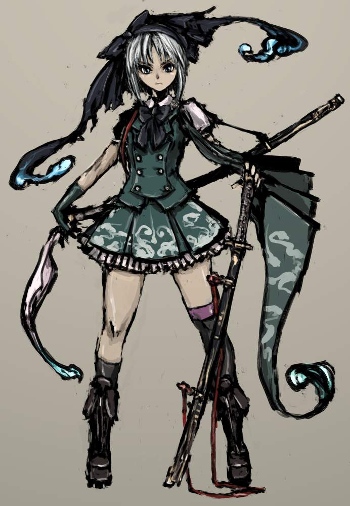 1girlasymmetrical clothesfemale focusfull bodykatanasheathsheathedsingle thighhighskirtsoloswordthighhighsweapon
