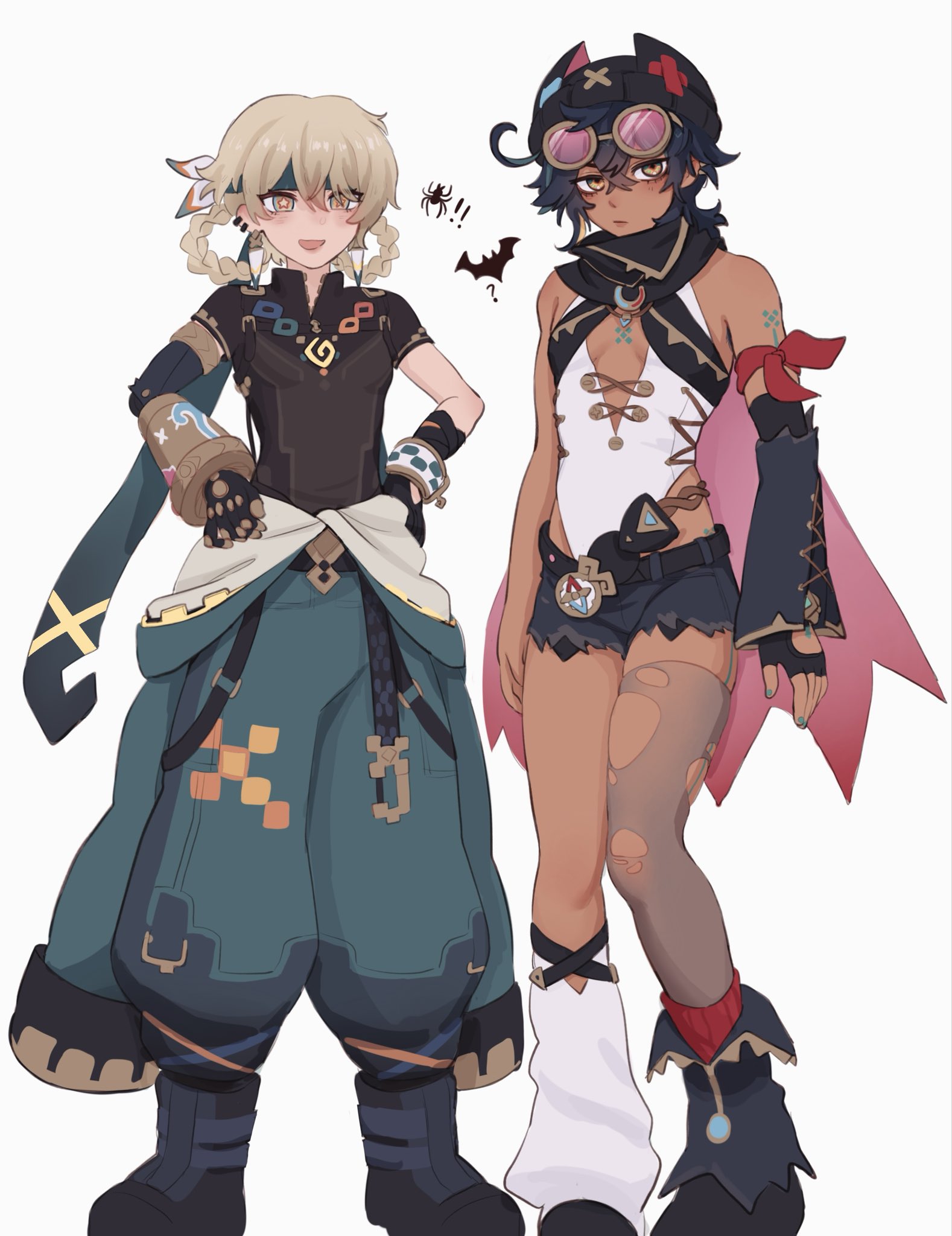 :d1boy1girlasymmetrical legwearbeltblack glovesblack hairblack shirtblonde hairblue shortsbootsbraceletbraidbrown eyesclosed mouthcosplaycostume switchcrossdressingcrossdressing (mtf)dark skindark-skinned maleearringsfingerless glovesfull bodyglovesgogglesgoggles on headhair between eyeshand on own hiphatheadbandjewelrylooking at viewermultiple boysnail polishopen mouthoversized clothespantsshirtshort shortsshortssimple backgroundsingle glovesingle sleevesingle thighhighsmilesocksstandingstar (symbol)star-shaped pupilssymbol-shaped pupilsthighhighstorn clothestwin braidswhite backgroundyellow eyes