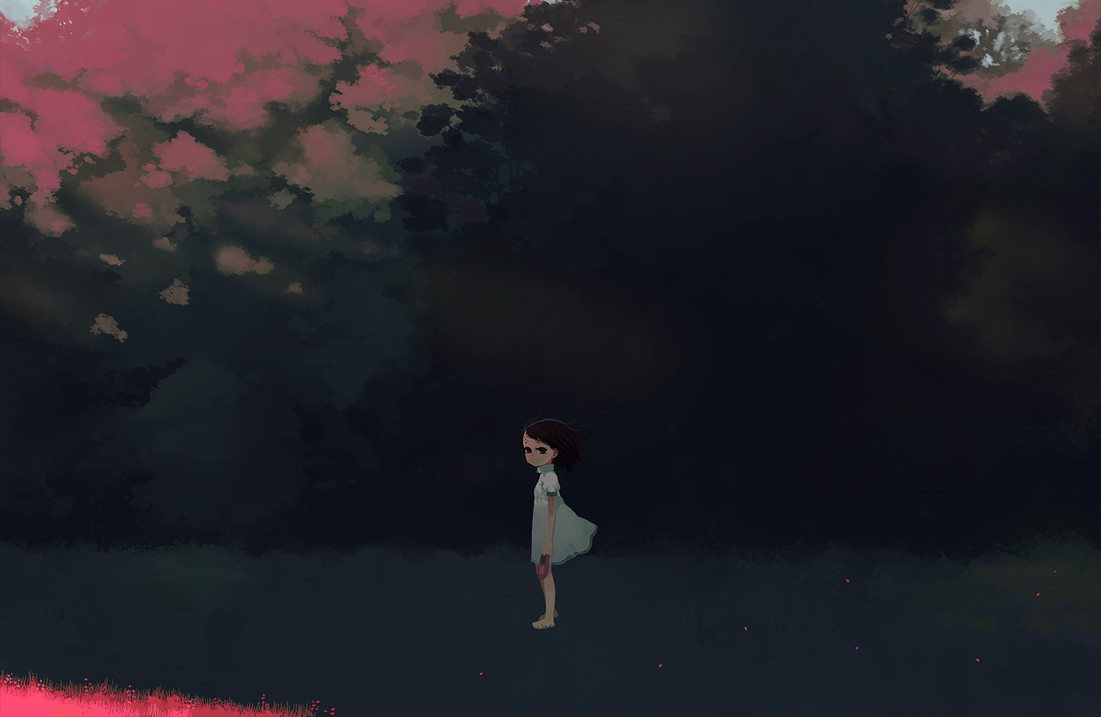 1girlbarefootchilddarkdressfemale focusgrassholdingholding shoesholding unworn clotheslooking at viewernaturesceneryshoessolounworn shoes