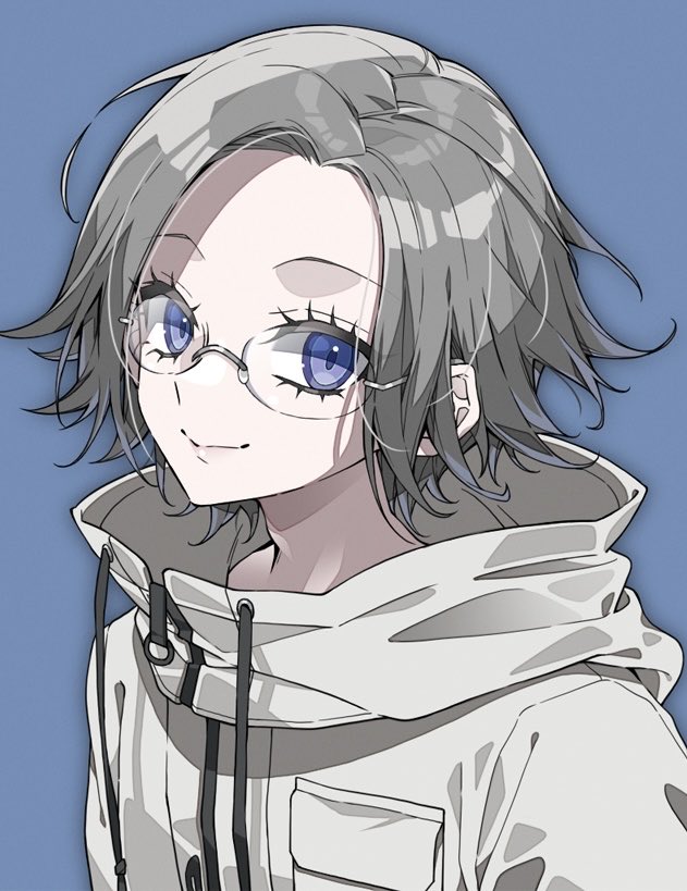 1boyeyelashesfront zipperglassesgrey hairhigh collarhoodhood downjacketlooking at viewermale focuspurple eyessemi-rimless eyewearsingle hair intakesmilewhite jacket