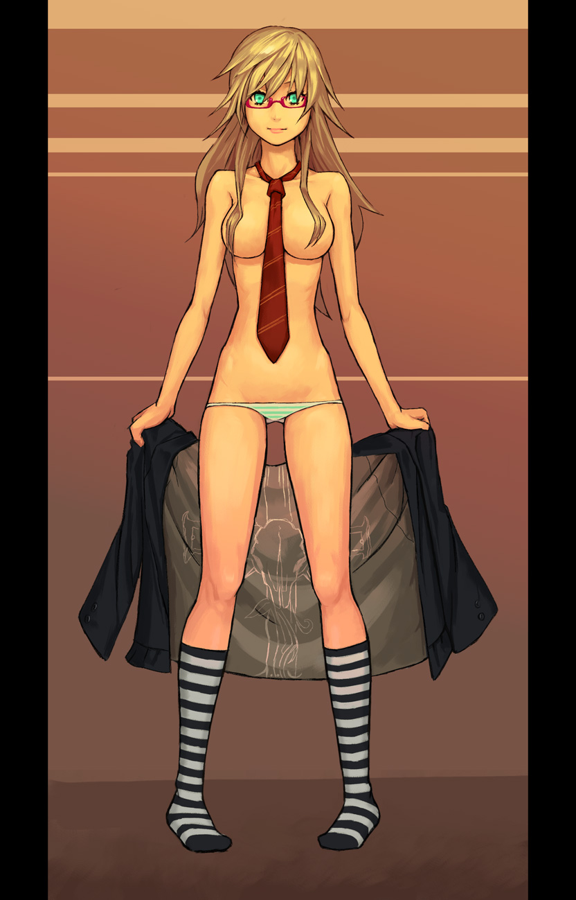 1girlblonde hairbreastscrossfemale focusglassesgreen eyeshair censorhair over breastsjacketlegslight smilelong hairlowleglowleg pantiesmedium breastsnecktiepantiessockssolostriped clothesstriped sockstopless femaleunderwearunderwear only