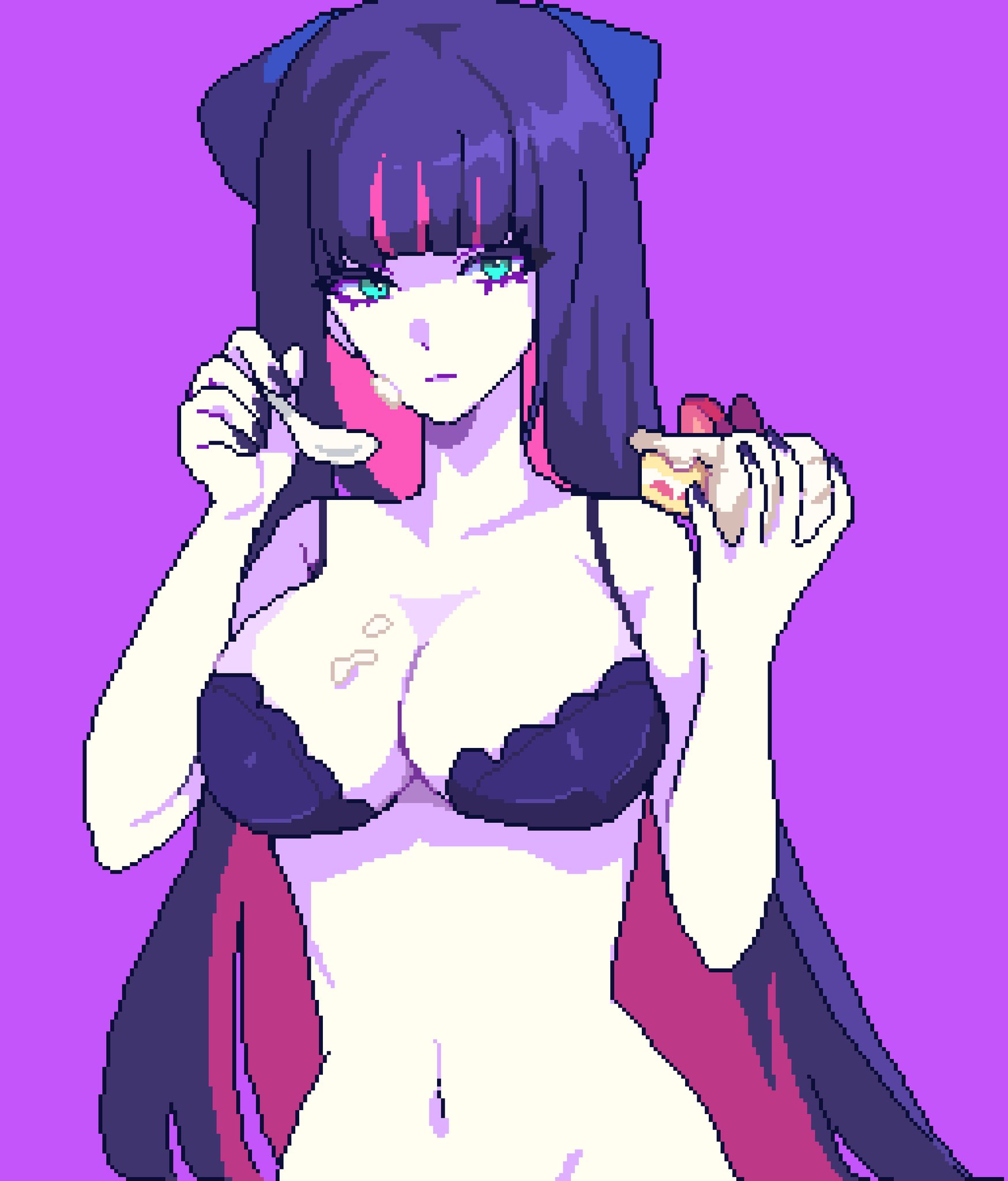 1girlaqua eyesblunt bangsbrabreastscakecake sliceclosed mouthcolored inner hairfoodfood on bodyfood on breastsfood on faceholdingholding cakeholding foodholding spoonlarge breastslong hairlooking at viewermulticolored hairnavelpixel artpurple backgroundpurple brapurple hairsimple backgroundsolospoonstomachunderwearunderwear onlyupper body