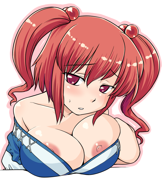 1girlareola slipblushbreastsbursting breastscleavagecovered erect nipplesfemale focuslarge breastslong hairnipple slipnipplesred eyesred hairsolosweattwintailstwo side up