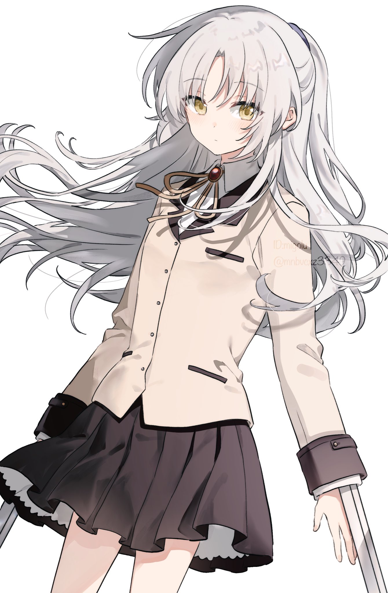1girlblack skirtbrown ribbonbuttonsclosed mouthcowboy shotjacketlong hairlong sleeveslooking at viewerneck ribbonparted bangspleated skirtponytailribbonsimple backgroundskirtsolowhite backgroundwhite hairwing collaryellow eyesyellow jacket