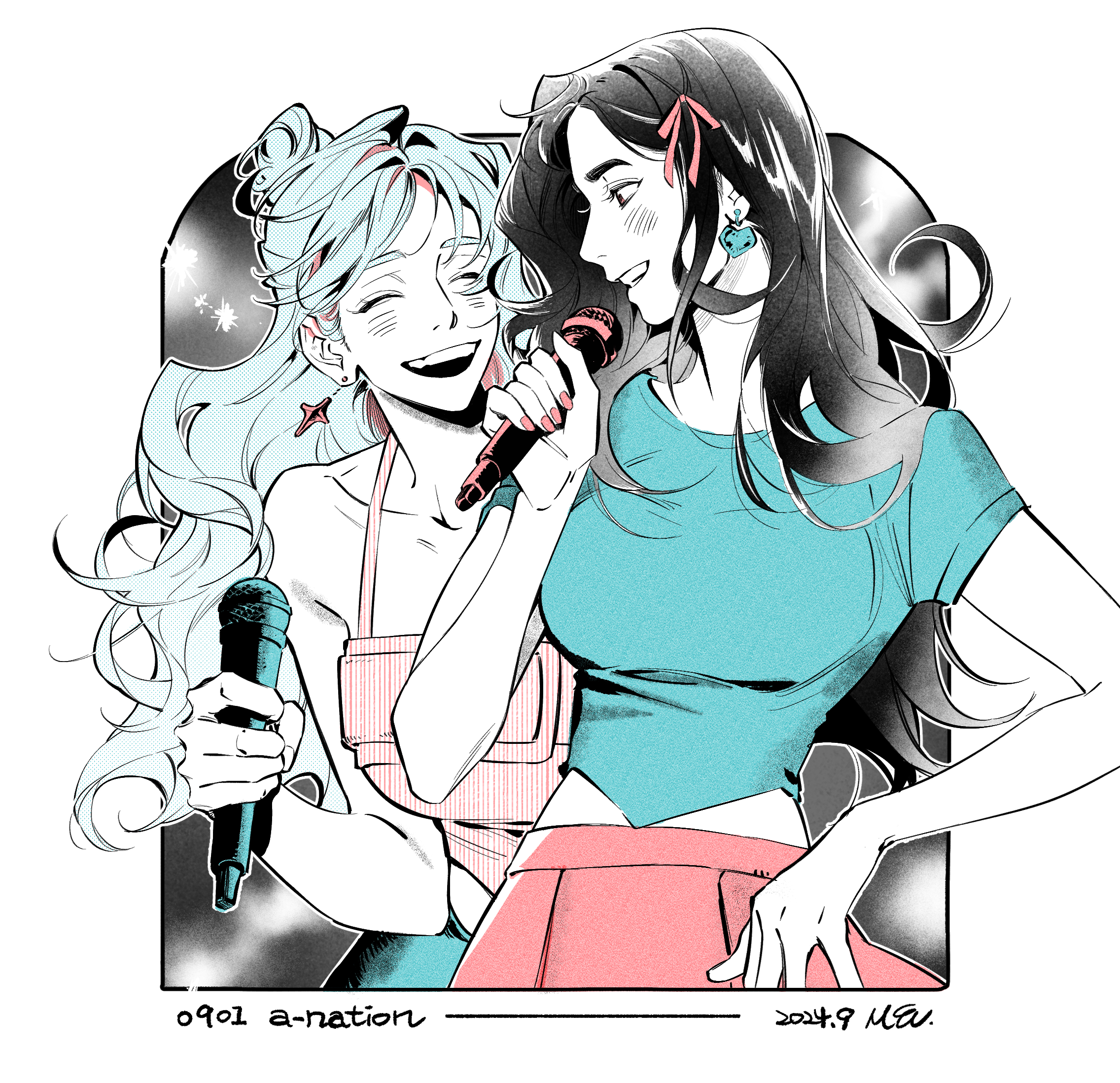 1boy2girlsaqua shirtblack hairbreastsclosed eyescollarboneearringsfingernailsgrinhair ribbonhand uphappyheartheart earringsholdingholding microphonejewelrylarge breastslong hairmicrophonemultiple girlsnavelopen mouthpantspink nailspink pantspink ribbonpink shirtribbonshirtshort sleevessimple backgroundsleevelesssleeveless shirtsmilespaghetti strapstraight hairstriped clothesstriped shirtvertical-striped clothesvertical-striped shirtwavy hairwhite backgroundwhite hair