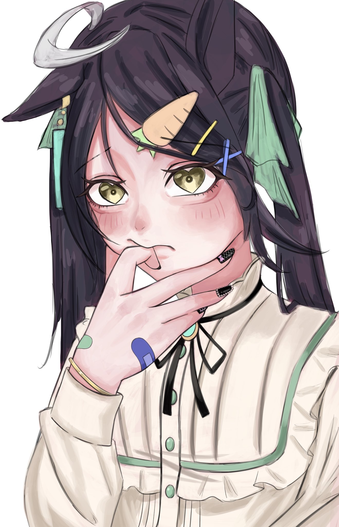 1girlaegyo salahogealternate hairstyleanimal earsbandaidbandaid on handbiting own fingerblack nailsblack ribbonblushbraceletcarrot hair ornamentcollared shirtdecoraear ornamentear tagearringsfood-themed hair ornamentfrilled shirtfrillsgreen ribbongrey hairhair ornamenthair ribbonhaircliphand upheartheart in eyehorse earshorse girljewelrylong bangslong hairlong sleevesmulticolored hairnail polishneck ribbonribbonshirtsimple backgroundsingle ear downsingle earringsoloswept bangssymbol in eyetwintailswhite backgroundx hair ornamentyellow eyesyellow shirt