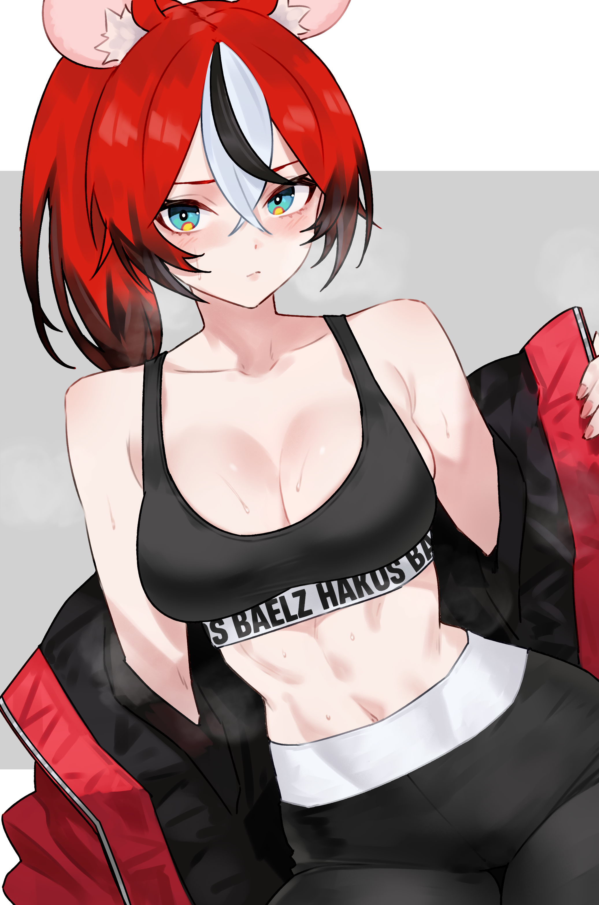 1girlalternate costumeanimal earsblack hairblack sports brablue eyesbreastscharacter namecleavageclosed mouthclothes writingcollarbonegrey backgroundhair between eyeshigh-waist pantsjacketlarge breastslooking at viewermedium hairmidriffmouse earsmouse girlmulticolored hairnavelpantsponytailred hairred jacketsolosports brasweattonedtwo-tone backgroundvirtual youtuberwhite backgroundwhite hair