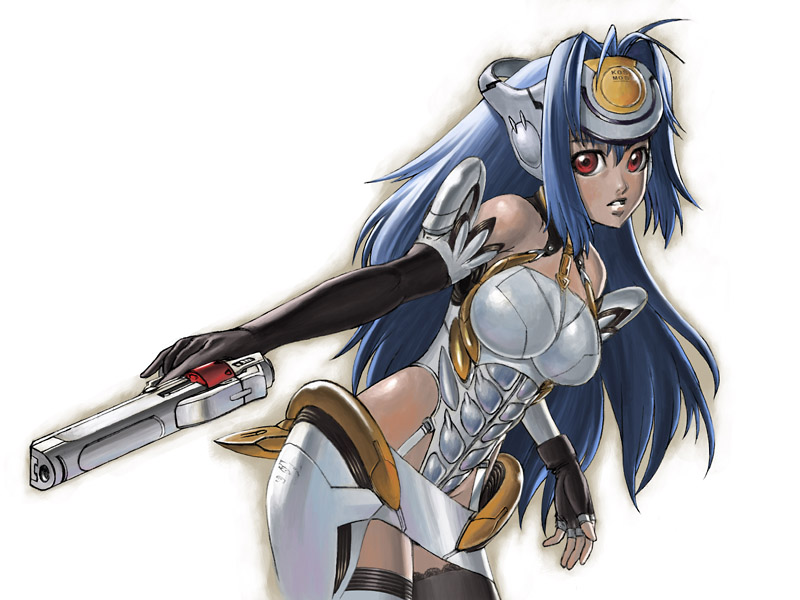 00s1girlblue hairbreastselbow glovesfemale focusglovesgradient backgroundgunhandgunpistolred eyessolothighhighsweapon