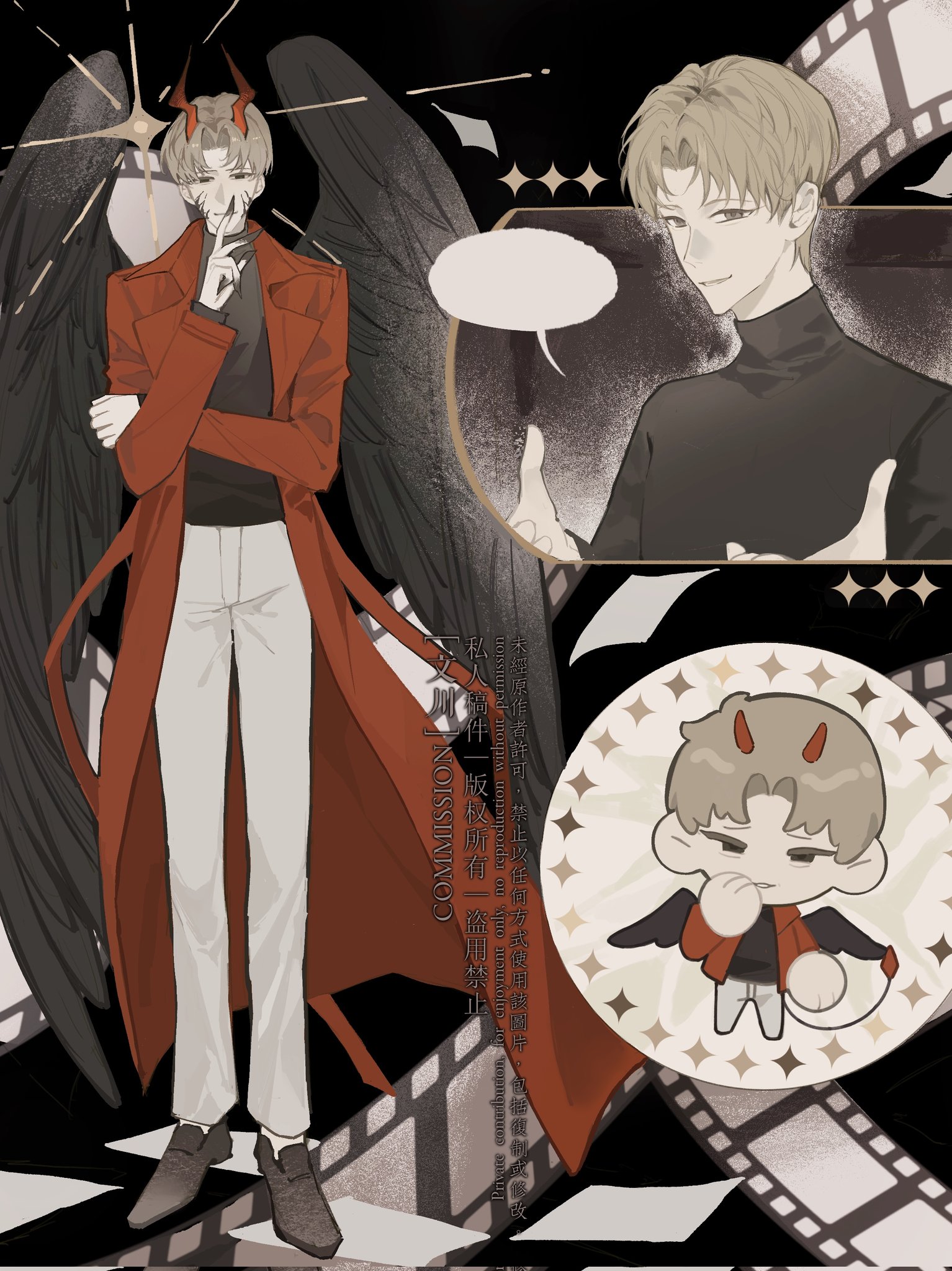 1boyblack shirtblack wingsblank speech bubbleblonde hairbrown eyescheon inhochibichibi insetcoatcrew neckcurtained hairdemon hornsfeathered wingsfilm reelfinger to mouthfingernailsfull bodyhornslarge handslong fingernailslooking at viewermultiple viewsnicayukoopen clothesopen coatred coatshirtshort hairshushingsparklespeech bubblestandingwings
