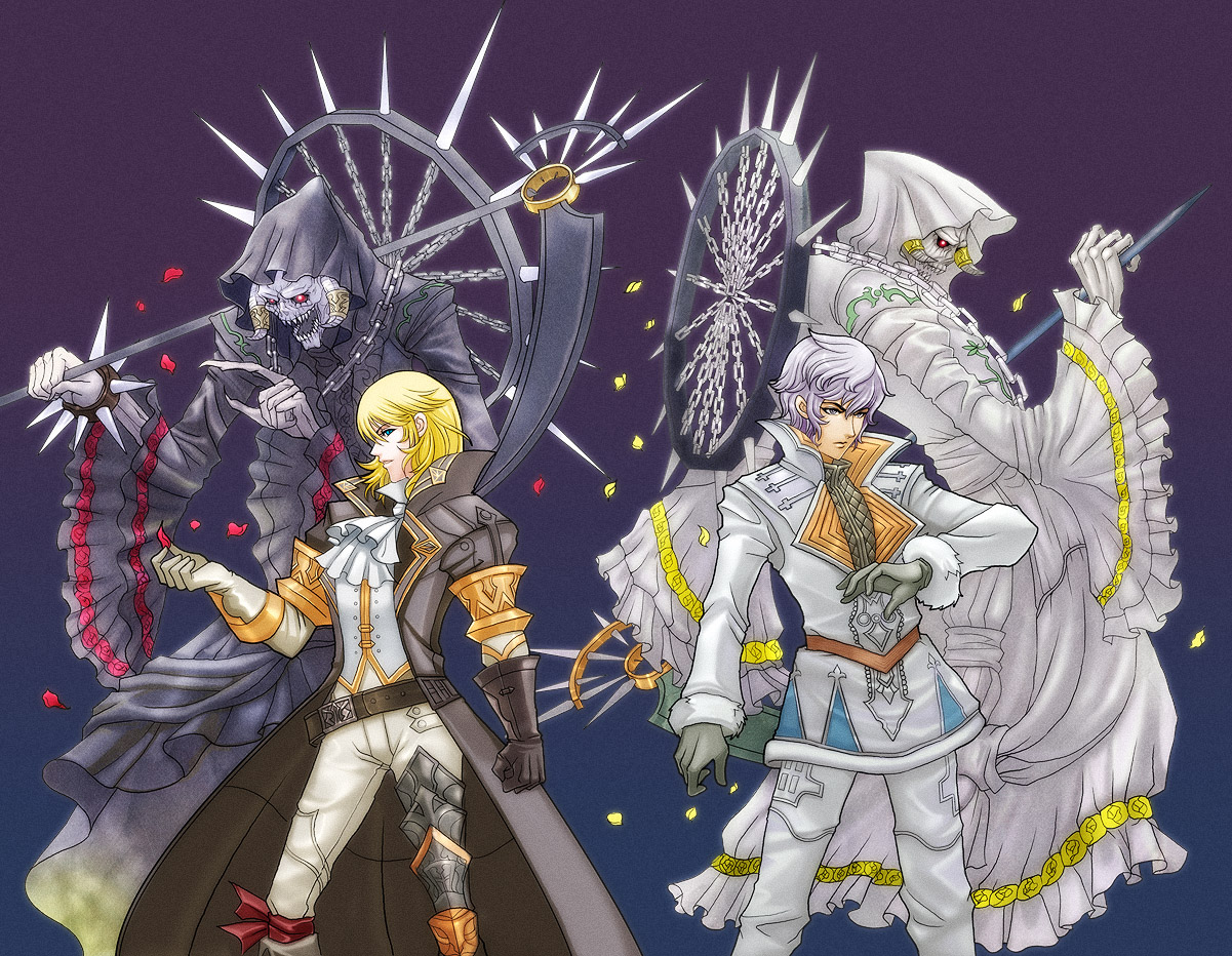2boysascotbeltblonde hairblue eyeschainflowergloveshornsmultiple boyspetalsrosescythewhite hair
