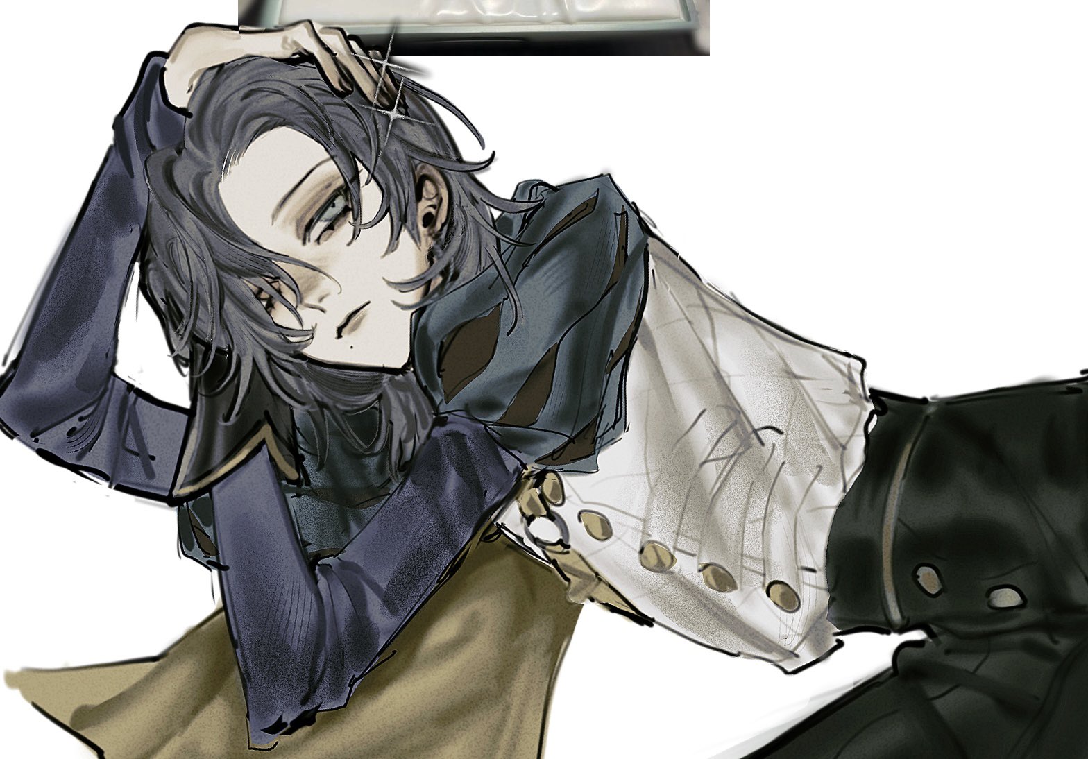 sumino takumi, the hundred line -last defense academy-, artist request, chinese commentary, commentary request, commission, second-party source, 1boy, :<, animal ears, antenna hair, black hair, blue eyes, blush, blush stickers, cat ears, chinese text, closed mouth, drawn ears, drawn whiskers, drawstring, grey jacket, heart, hood, hood down, hoodie, jacket, jacket over hoodie, male focus, multicolored hair, open clothes, open jacket, portrait, red hair, short hair, simple background, single blush sticker, solo, speech bubble, streaked hair, two-tone hair, watermark, weibo watermark, white background, white hoodie