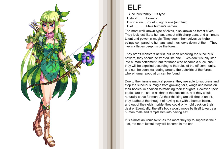 1girlarrow (projectile)blue eyesbow (weapon)character profileelfenglish textfemale focusflowergreen hairhigh heel sandalshigh heelsleaf clothinglong hairmonster girlpointy earssandalssheathsheathedshoessoloswordweapon