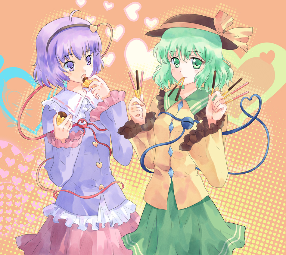 2girlscandyeatingfemale focusfoodgreen eyesgreen hairhairbandhatheartmultiple girlspockypurple eyespurple hairshort hairsiblingssisters