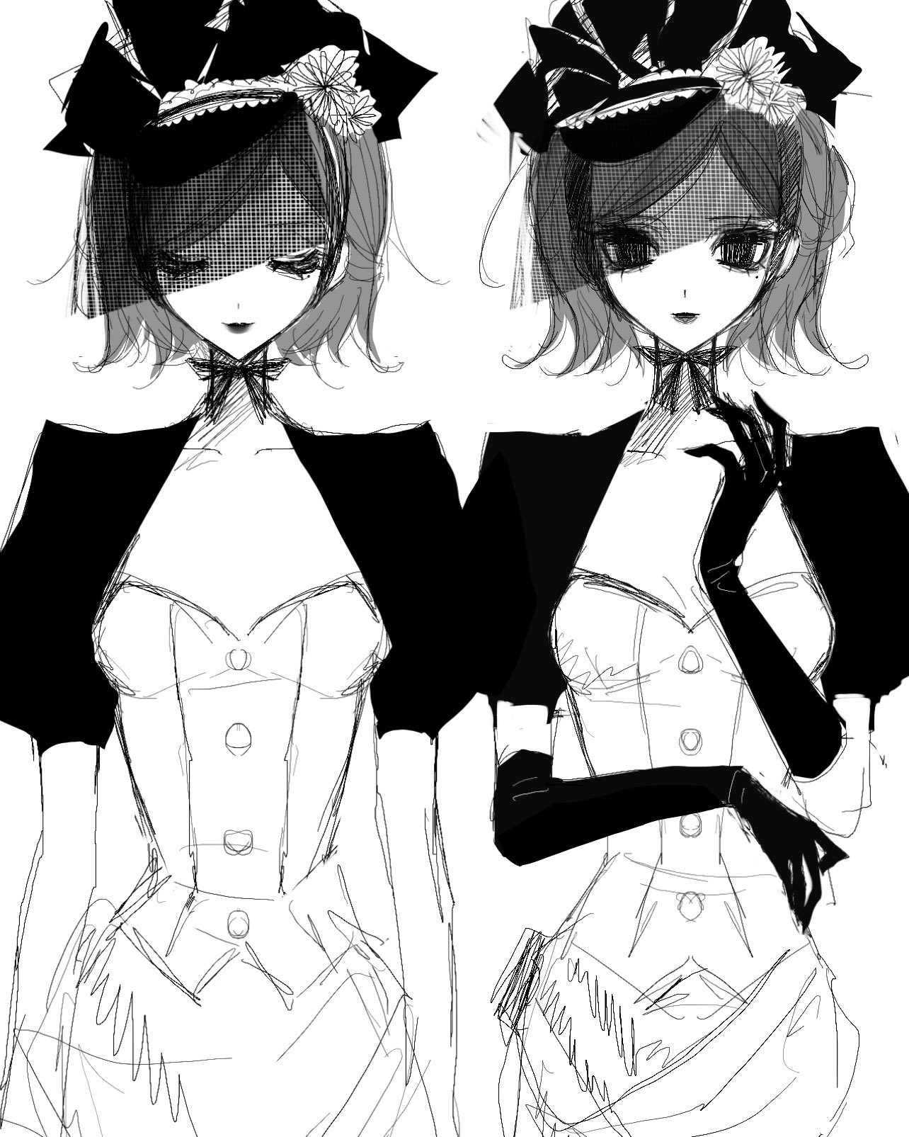 2girlsblack eyesblack glovesblack lipsblack veilchloe nairclosed eyescollarboneelbow glovesempty eyesflowerglovesgreyscalehathat flowerlooking at viewermedium hairmolemole under eyemonochromemultiple girlspuffy sleevessee-through clothessee-through veilstraight-onveil