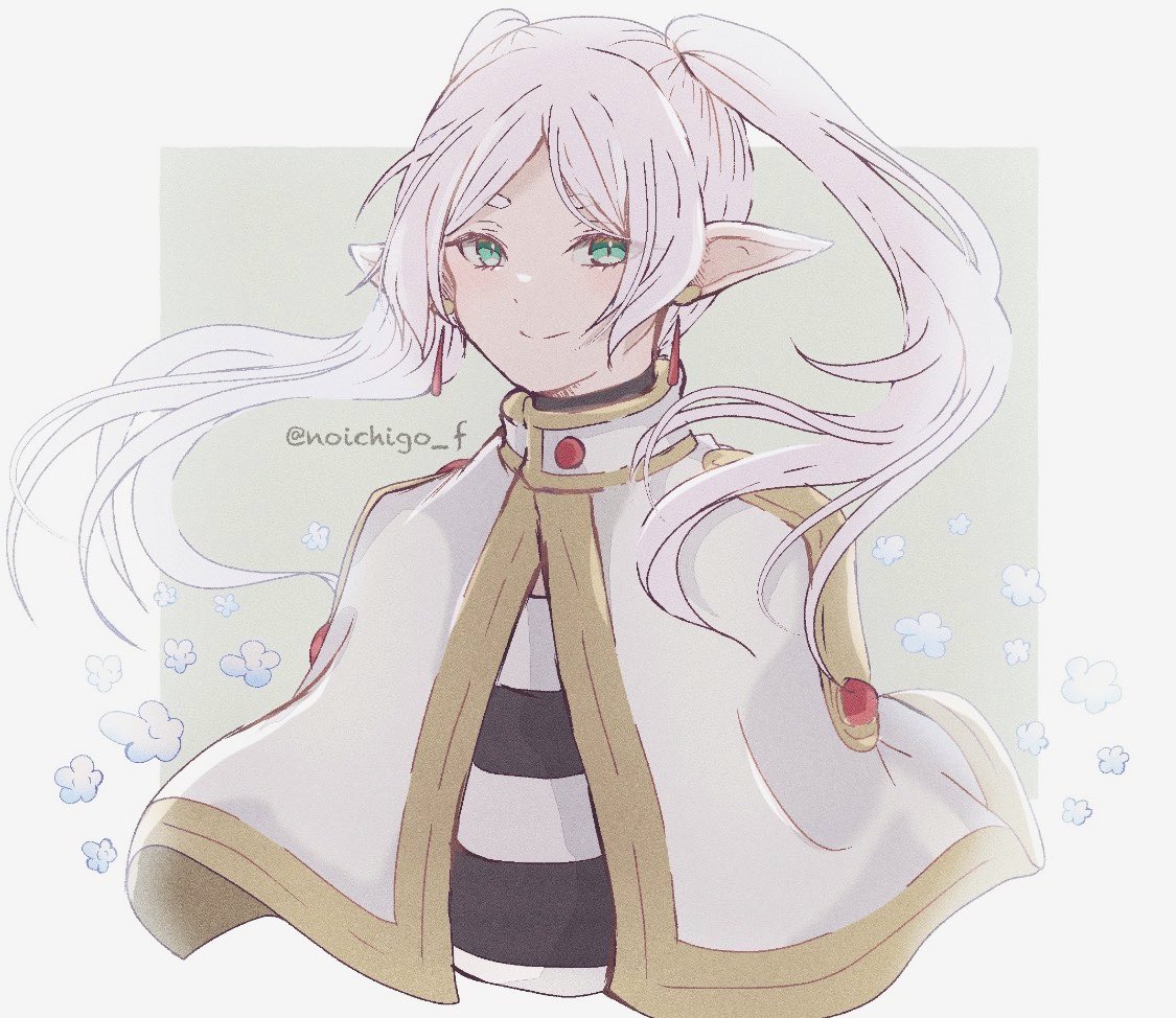 1girlblue flowerbordercapeletclosed mouthcropped torsoearringselfflowerforget-me-not (flower)gold trimgreen eyesgrey backgroundgrey hairjewelrylong hairlooking at viewerparted bangspointy earsshirtsmilesolostriped clothesstriped shirttwintailstwitter usernamewhite borderwhite capelet