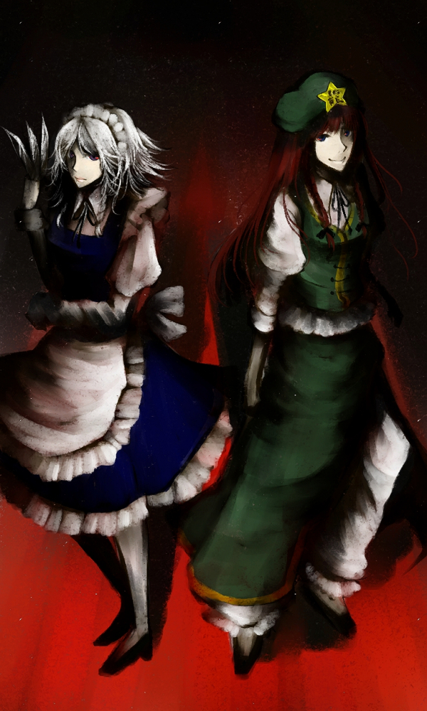 2girlsfemale focushatknifelong hairmaidmultiple girlsred eyesred hairshort hairstar (symbol)throwing knifeweapon