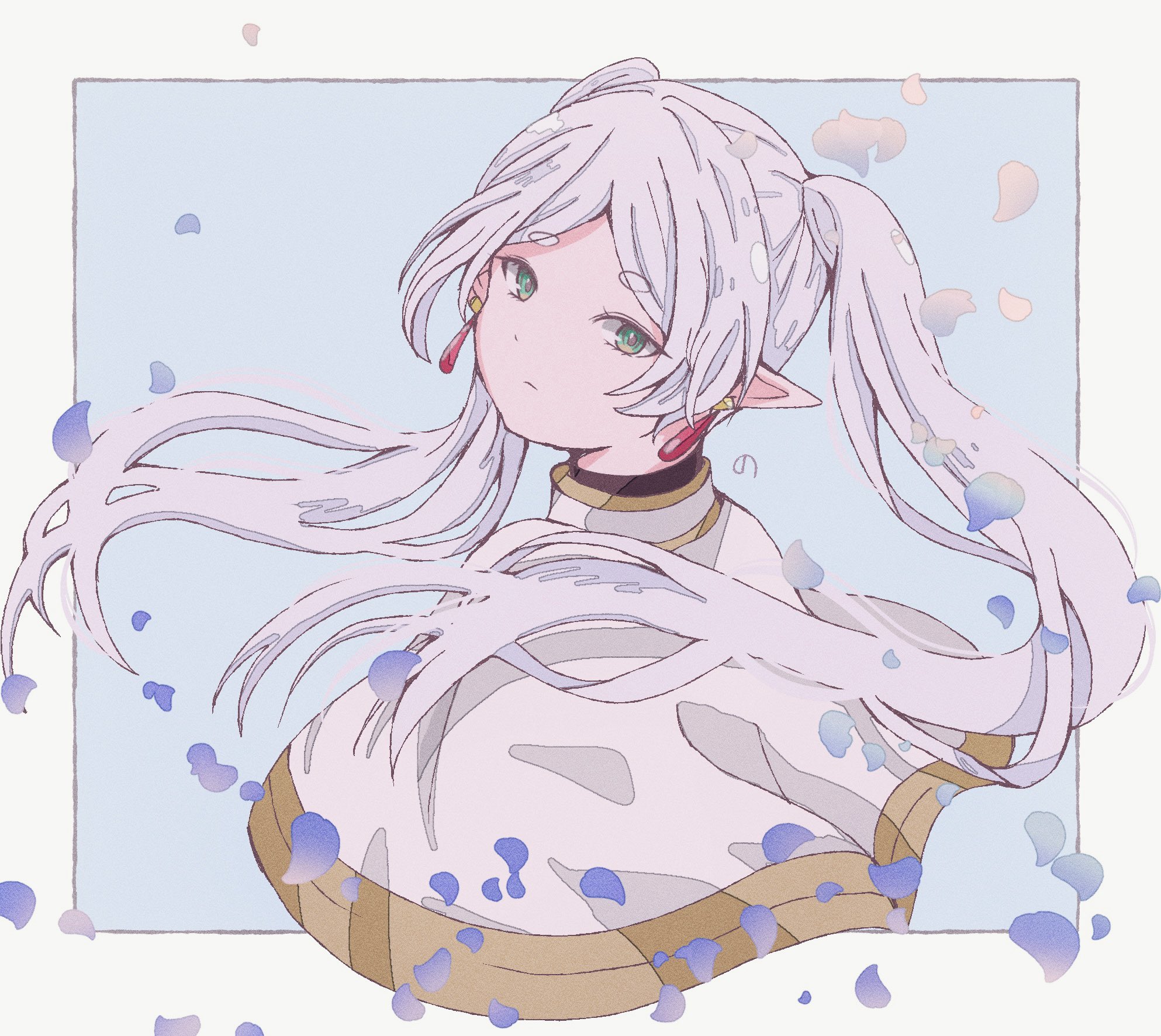 1girlblue backgroundblue petalsbordercapeletclosed mouthearringselffalling petalsgold trimgreen eyesgrey hairjewelrylong hairlooking at viewerparted bangspetalspointy earsshort eyebrowssolotwintailsupper bodywhite borderwhite capelet