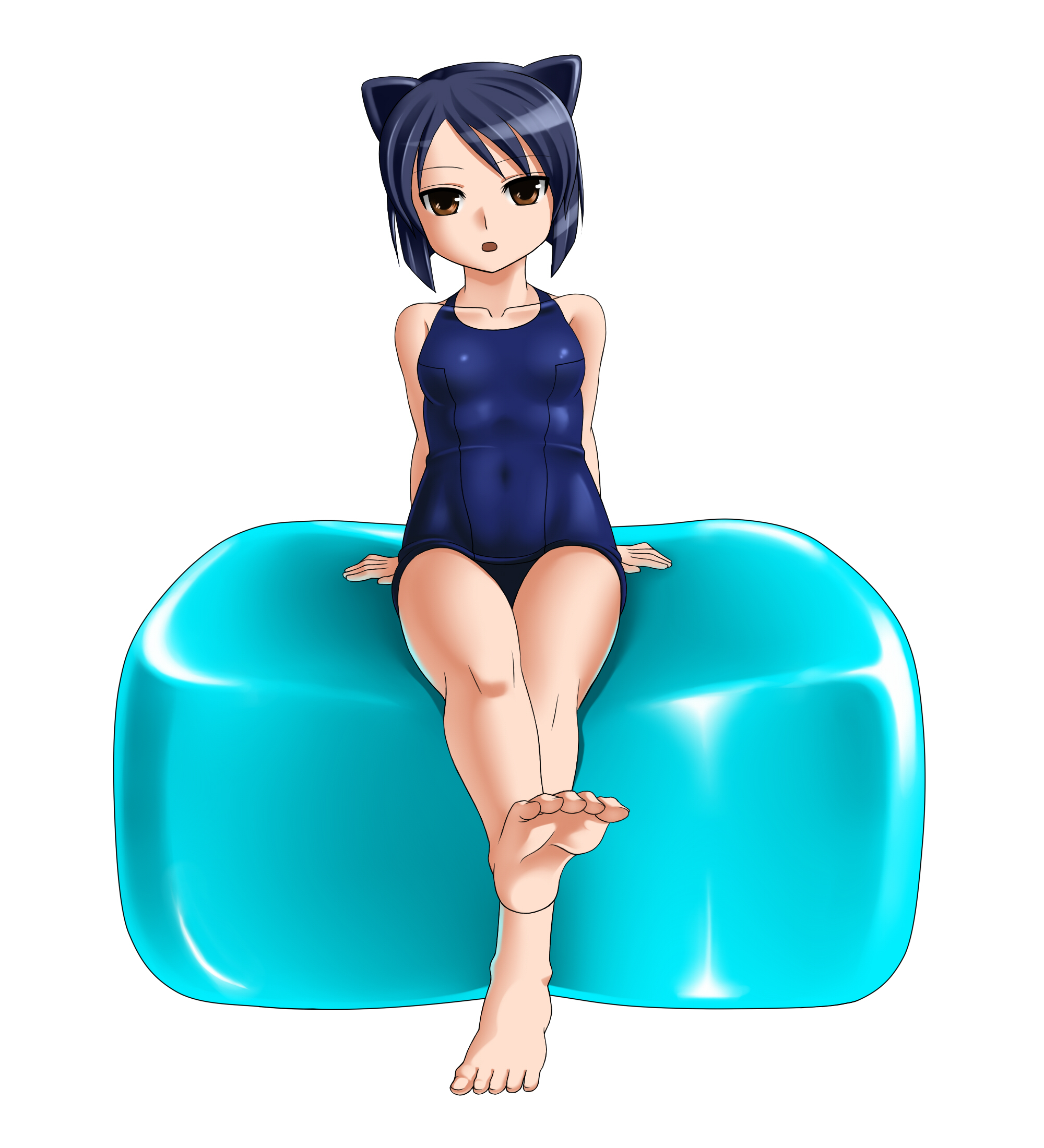 1girlanimal earsbarefootblack hairbrown eyescat earsfeetfemale focusone-piece swimsuitschool swimsuitsolessoloswimsuittoes