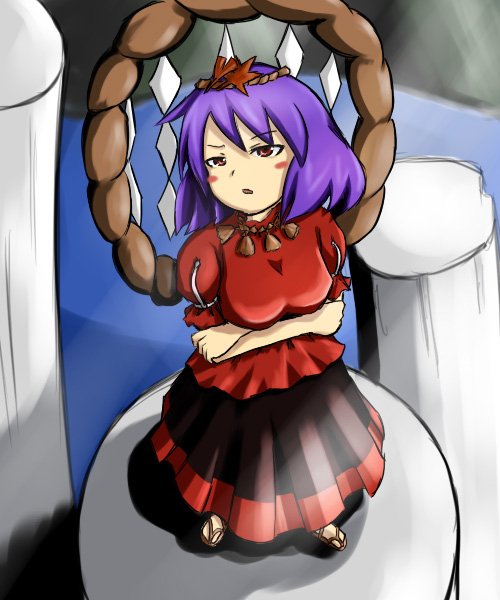 1girlcrossed armsfemale focushair ornamentleaf hair ornamentpurple hairred eyesropeshort hairsolo