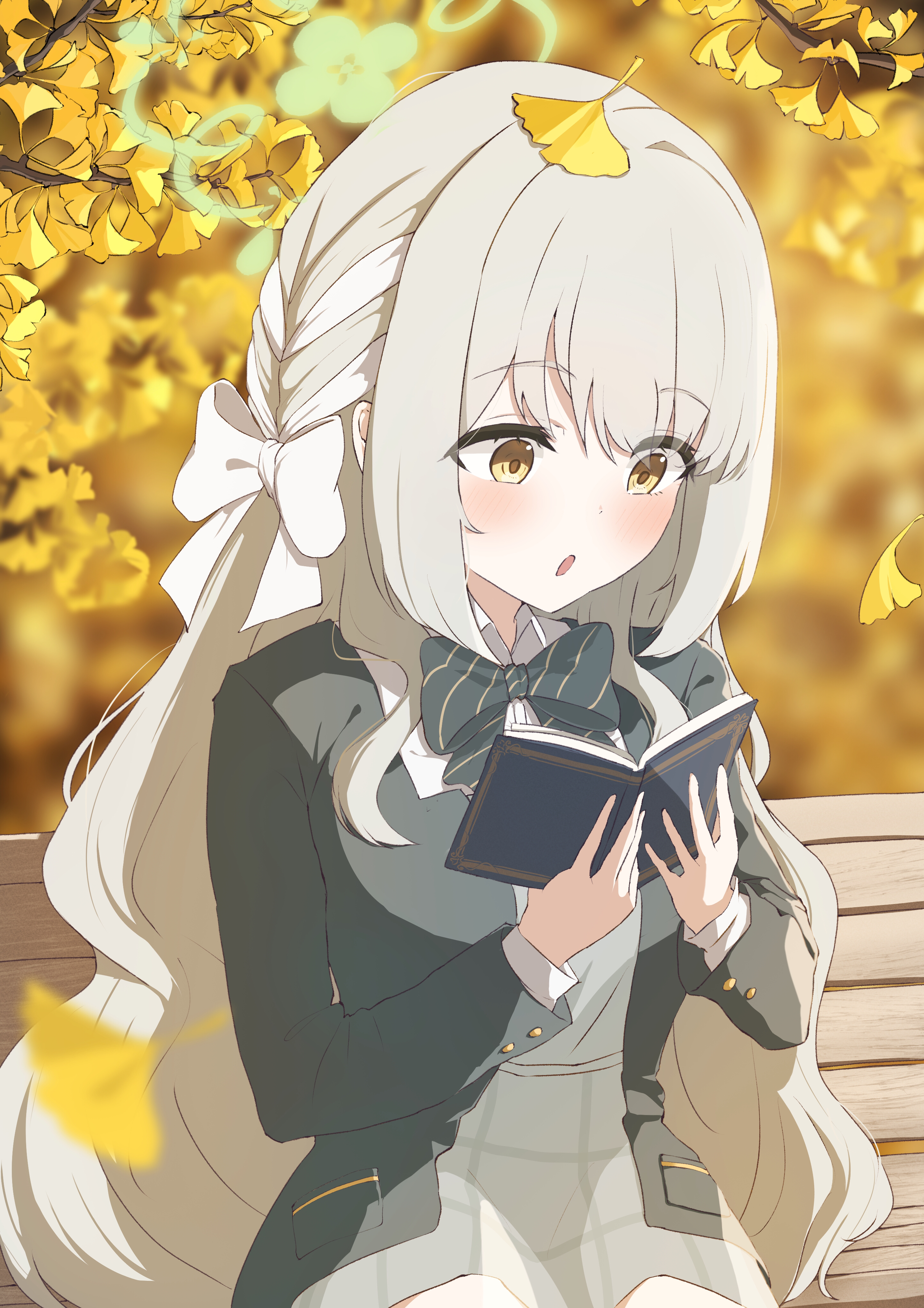 1girlbenchblushbookshelfbowbowtiegrey hairhair bowhalolooking at viewermulticolored hairsolotwo-tone hairupper bodywhite hair