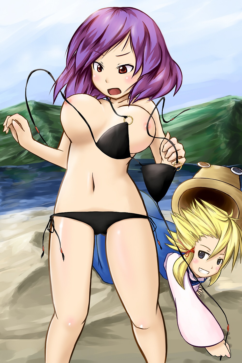 2girlsassisted exposurebikiniblonde hairbreastsdayfemale focushatlarge breastsmultiple girlsnavelnipplespurple hairred eyesshort hairside-tie bikini bottomswimsuitwardrobe malfunction