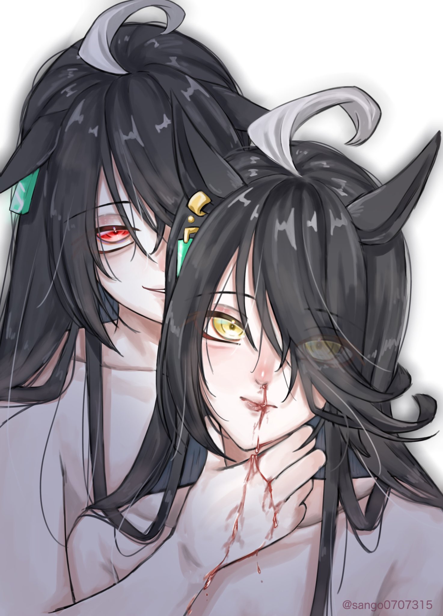 2girlsaegyo salanimal earsbare shouldersbloodblood on faceblood on handsclosed mouthcollarboneear ornamentear tagearringsears downeyes visible through hairhand on another's chinhand on another's neckhorse earshorse girljewelrylong bangsmultiple girlsnosebleedsimple backgroundsingle earringsolotwitter usernamewhite backgroundyellow eyes